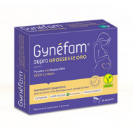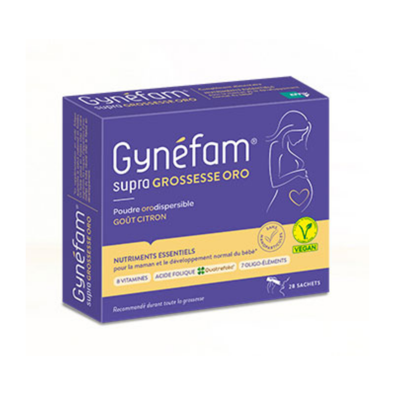 Gynéfam® supra GROSSESSE ORO apporte des nutriments essentiels (vitamines dont l’acide folique, oligo-éléments et minéraux) pour contribuer à une grossesse normale et à un développement normal de votre bébé.