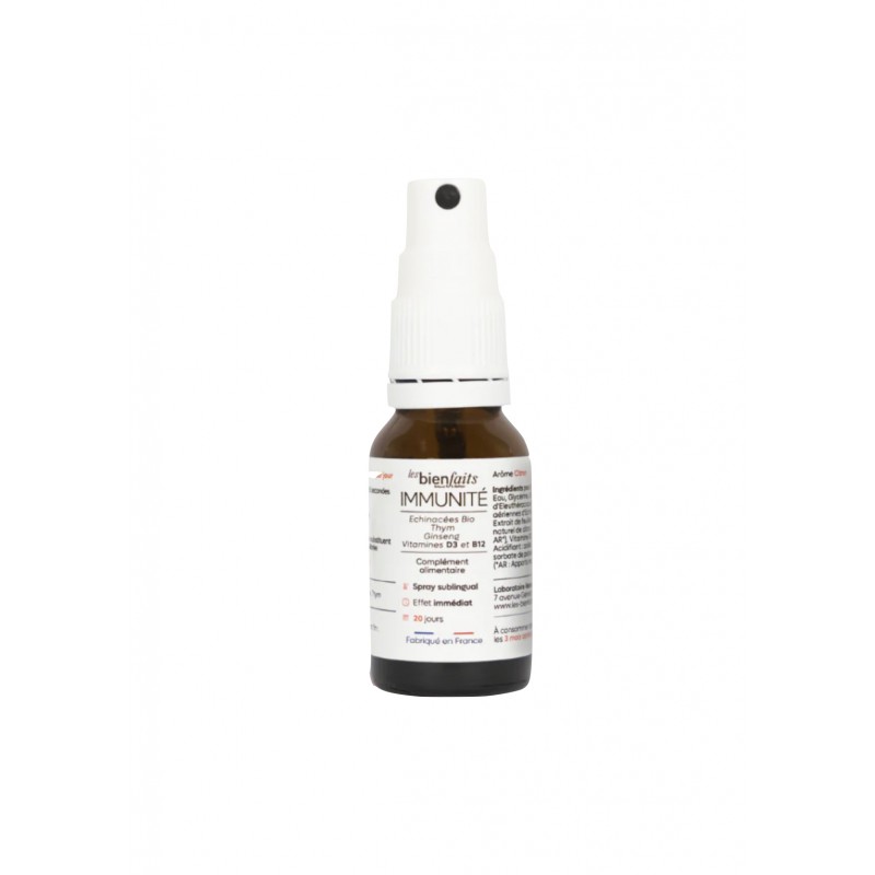 4 pulvérisations (0,666 ml) : Eau, Glycérine, Extrait de racines d'Eleuthérocoque 75 mg, Extrait de parties aériennes d'Echinacée pourpre 37,5 mg, Extrait de feuilles de Thym 20 mg, Arôme naturel de citron, Vitamine D3 25 ug (soit 50% AR*), Vitamine B12 3 ug (soit 120% AR*), Acidifiant : acide citrique, Conservateurs: sorbate de potassium, benzoate de sodium. (*AR :Apports recommandées).