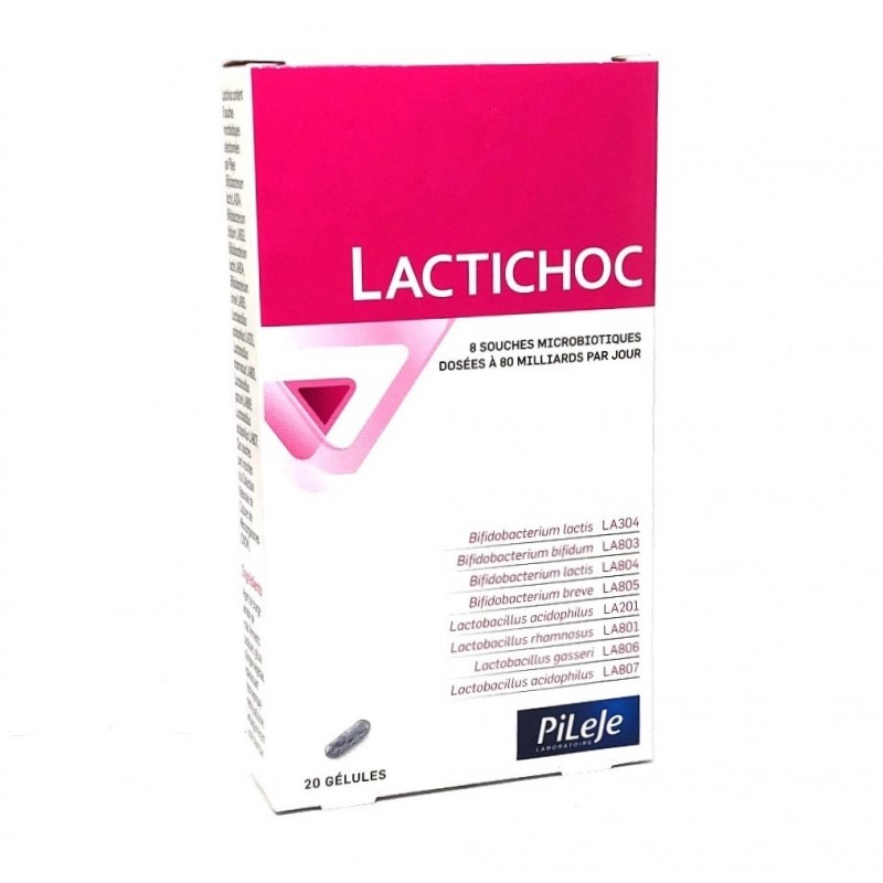 Lactichoc est un complément alimentaire à base de 8 souches probiotiques dosées à 80 milliards par jour pour 2 gélules.