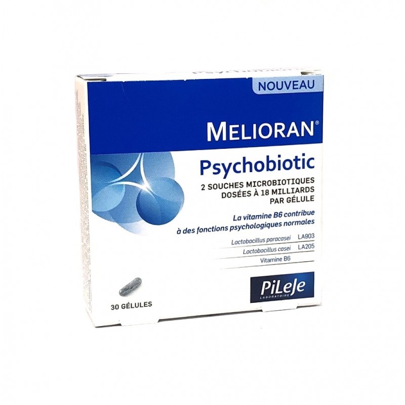 Melioran Phychobiotic contient 2 souches microbiotiques, dosées à 18 milliards par gélule, et de la vitamine B6.
